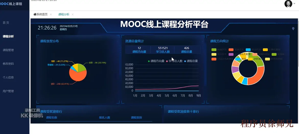 Python基于Django的MOOC线上课程推荐数据分析与可视化系统,系统以慕课教育平台近两年的运营数据为基础,进行深入的数据分析与可视化展示,从而为平台制定科学、全面的线上课程推荐策略提供数据支持,更好地服务广大线上用户。通过对用户行为数据和学习历史的分析,系统能够挖掘用户的学习偏好与需求,实现更精准的课程推荐,有效提升用户的学习体验,帮助学生快速找到最符合自身需求的优质课程。