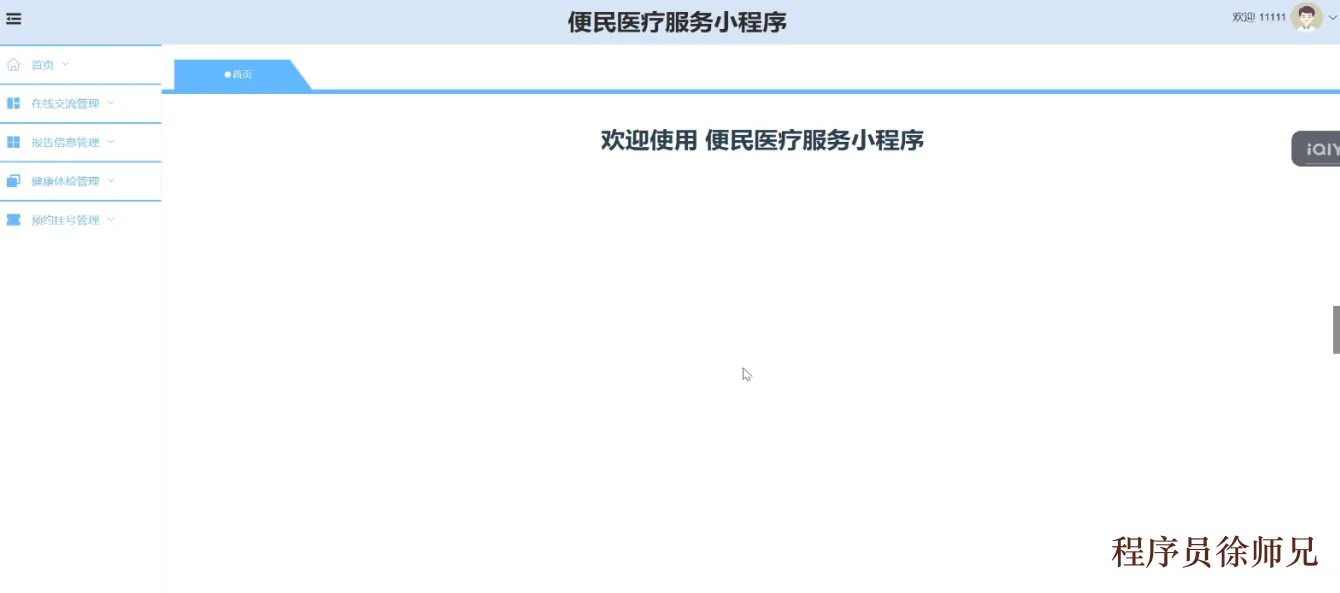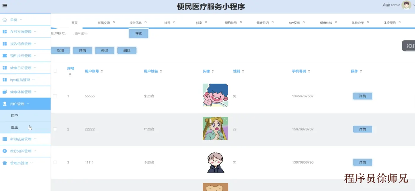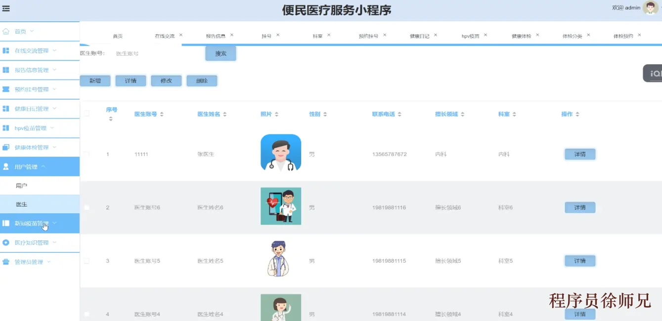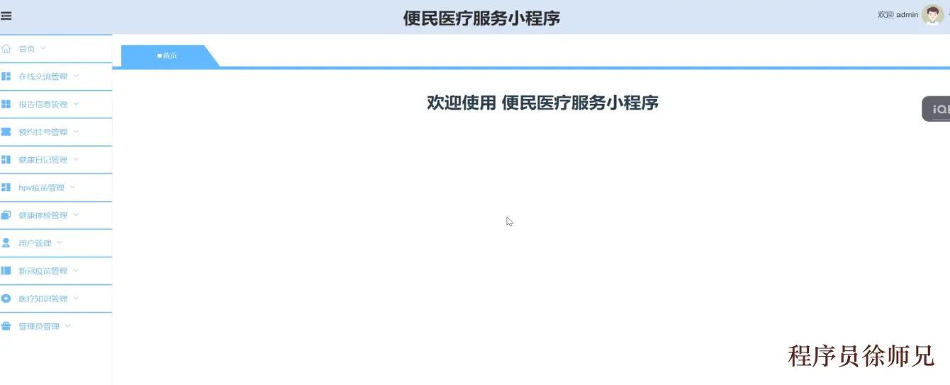 管理员进入系统主页面,主要功能包括对首页、在线交流管理、报告信息管理、预约挂号管理、健康日记管理、hpv疫苗管理、健康体检管理、用户管理、新冠疫苗管理、医疗知识管理、管理员管理等进行操作。如图4-4所示: