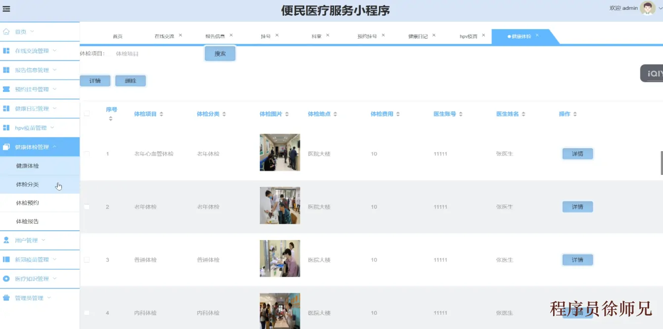 管理员点击健康体检,在健康体检页面的对体检项目、体检分类、体检图片、体检地点、体检费用、医生账号、医生姓名等信息,进行搜索或者删除健康体检等操作,如图4-9所示。