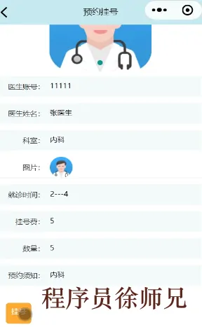 用户点击预约挂号,在预约挂号页面的搜索栏输入医生姓名,进行搜索,然后可以查看医生账号、医生姓名、科室、图片、就诊时间、挂号费、数量等信息,如有需要点击挂号等详情操作,如图4-2所示。