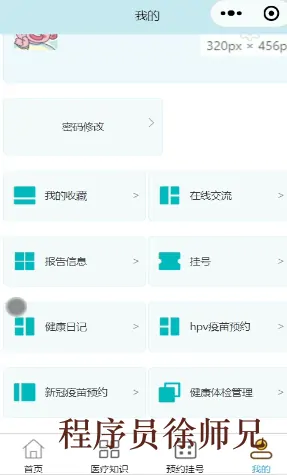 用户点击我的页面,在我的页面可以对我的收藏、在线交流、报告信息、挂号、健康日记、hpv疫苗预约、新冠疫苗预约、健康体检管理等信息,进行详细操作,如图4-3所示。