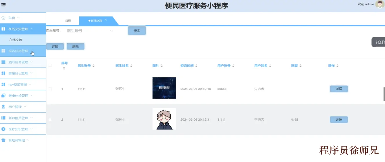 管理员点击在线交流,在在线交流页面的输入医生账号、医生姓名、图片、咨询时间、用户账号、用户姓名、回复等信息,进行搜索或者删除在线交流等操作,如图4-7所示。