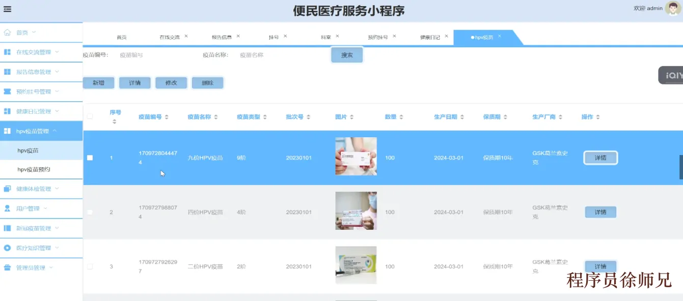 管理员点击hpv疫苗,在hpv疫苗页面的对疫苗编号、疫苗名称、疫苗类型、批次号、图片、数量、生产日期、保质期、生产厂家等信息,进行搜索、新增或者删除hpv疫苗等操作,如图4-8所示。