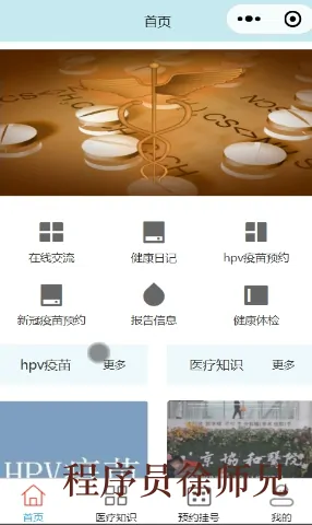 当游客打开微信小程序的网址后,首先看到的就是微信小程序首页界面。在这里,游客能够看到便民医疗服务小程序的导航条显示首页、医疗知识、预约挂号、我的等,如图4-1所示。