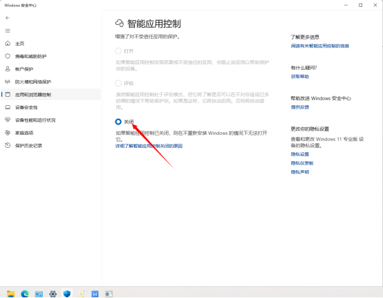 关闭SAC评估模式:进入「设置 > 隐私和安全性 > Windows安全中心 > 应用和浏览器控制 > 智能应用控制设置」,选择「关闭」或切换至评估模式(系统将自动学习并减少误报)。