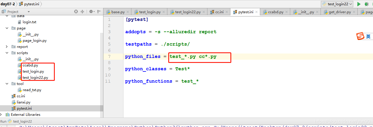 python_files如需要控制多测试用例脚本是可以使用空格隔开。