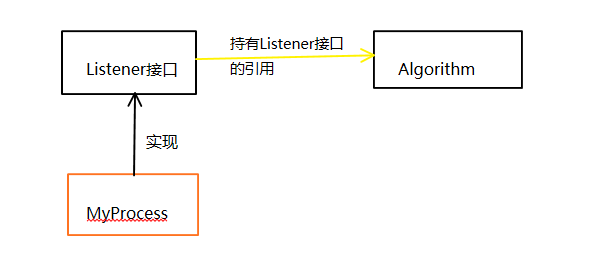 1、定义一个监听器接口,有两个地方用到:在算法运行入口的那个类(如本例的MyProcess)要实现这个接口;算法内部要有监听器这个属性,以便调用监听器的回调方法。