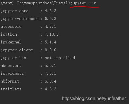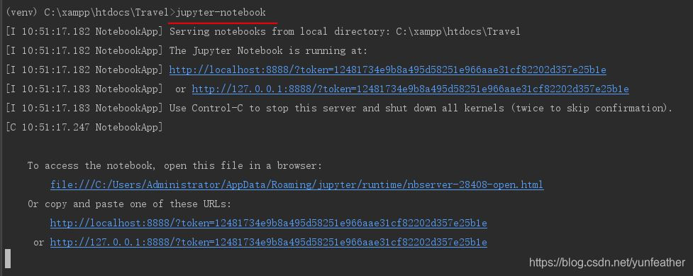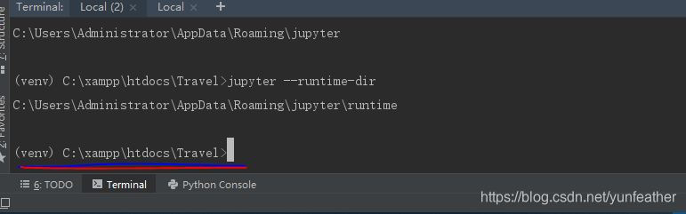 先打开pycharm的控制台 使用pip命令下载jupyter:pip jupyter(可能由于网络问题会失败,多试几次) 下载完成后,使用jupyter --v命令查看时候安装完毕 接着使用jupyter-notebook命令进入 浏览器会自动跳转到jupyter-notebook页面,或者点击上图中的网址