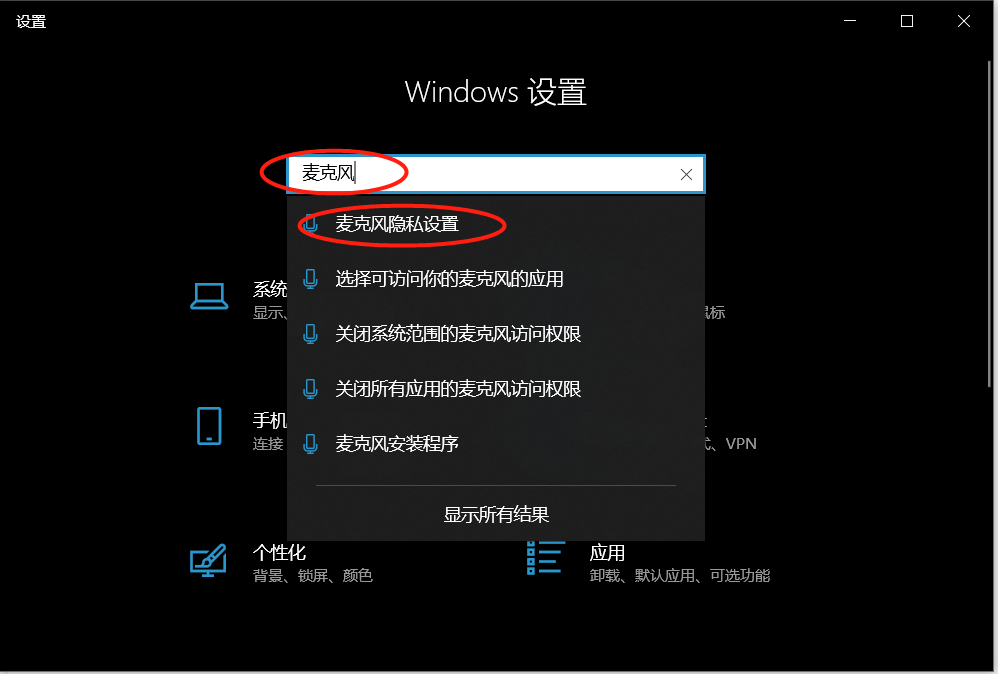 然后搜索框里输入“麦克风”,选择“麦克风隐私设置”。