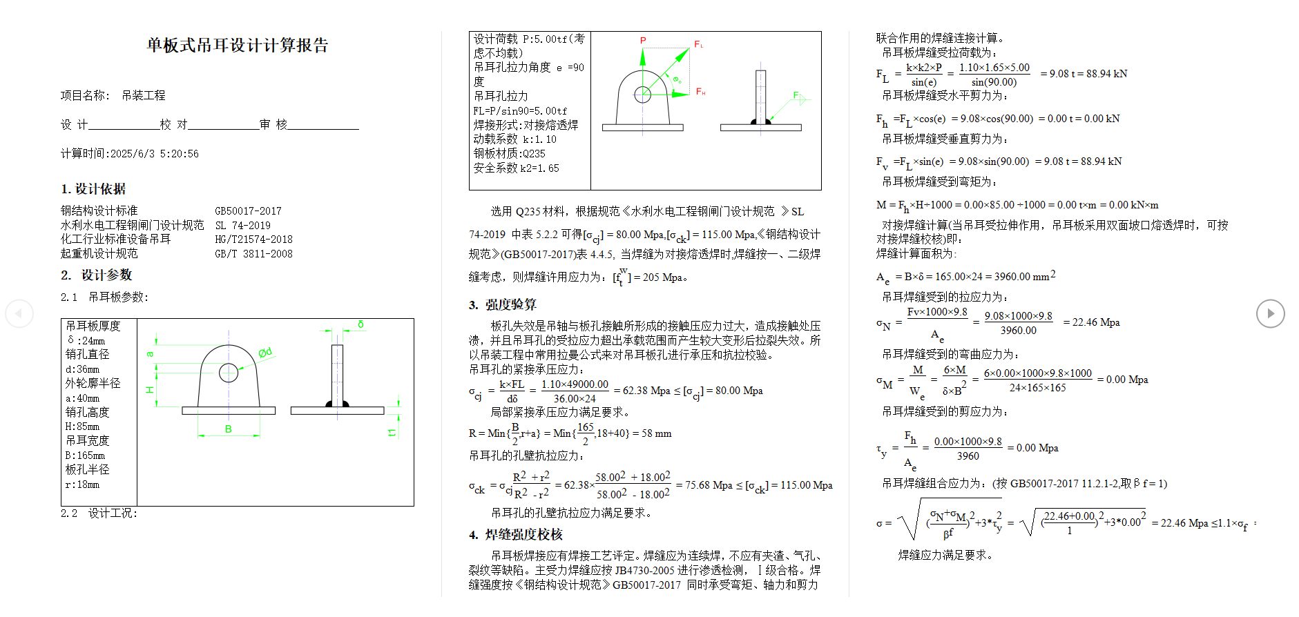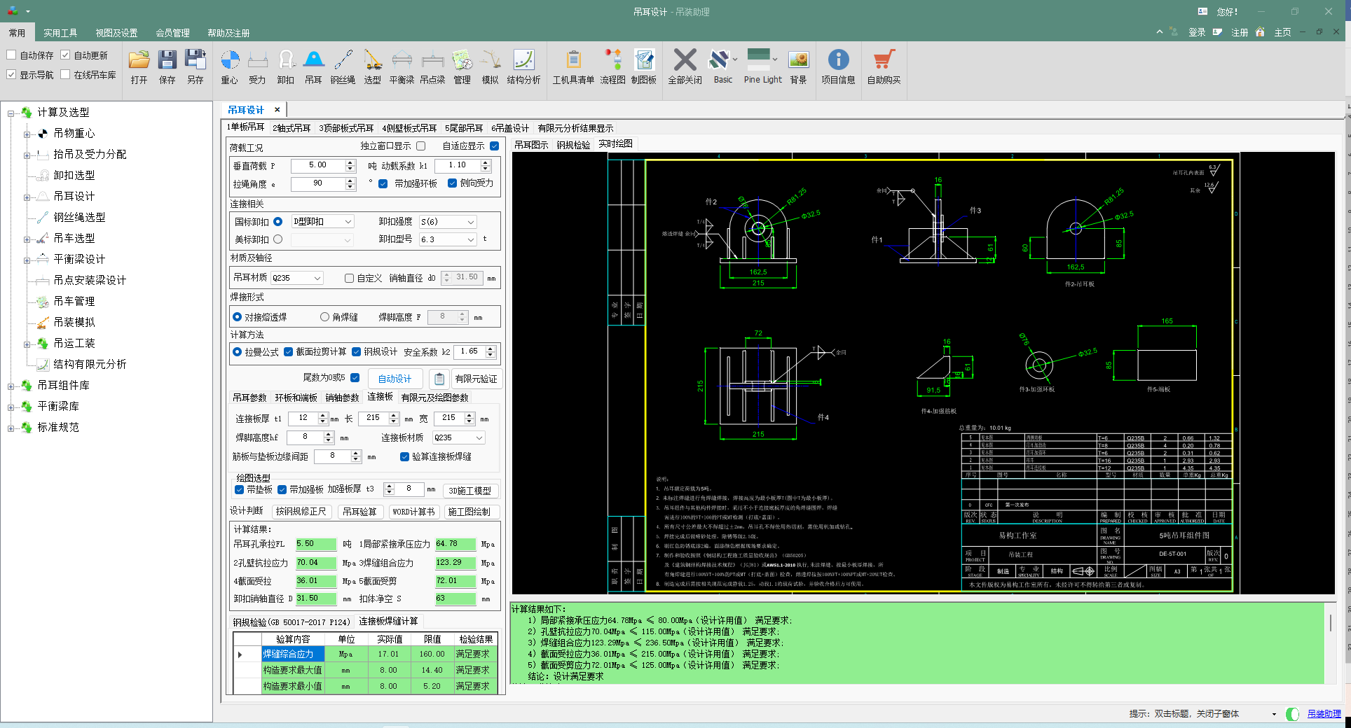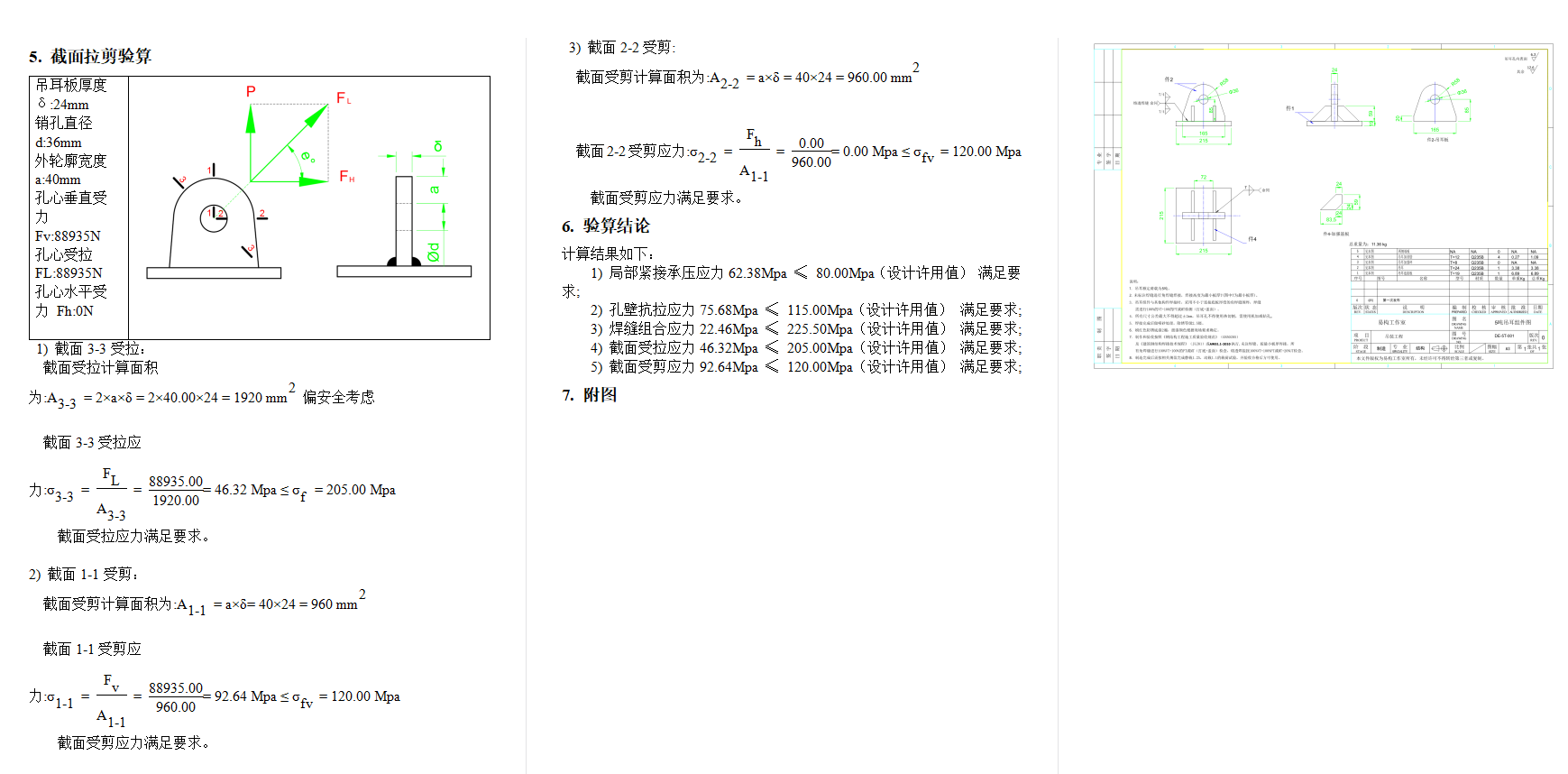 - 可进行钢结构设计规范检验和吊耳连接板焊接焊缝计算,并实时绘制施工图,输出Dxf,Dwg等可编辑格式的图纸。