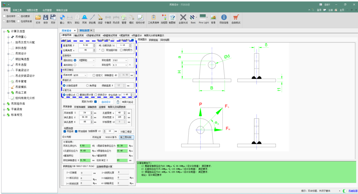 单板式吊耳一般按标准选用。但由于标准上吊耳的形式单一,材质固定,不能提供详细的计算报告等原因,很难满足各行各业的工程日常需求。因此,通常采用专业的吊耳设计软件进行设计。