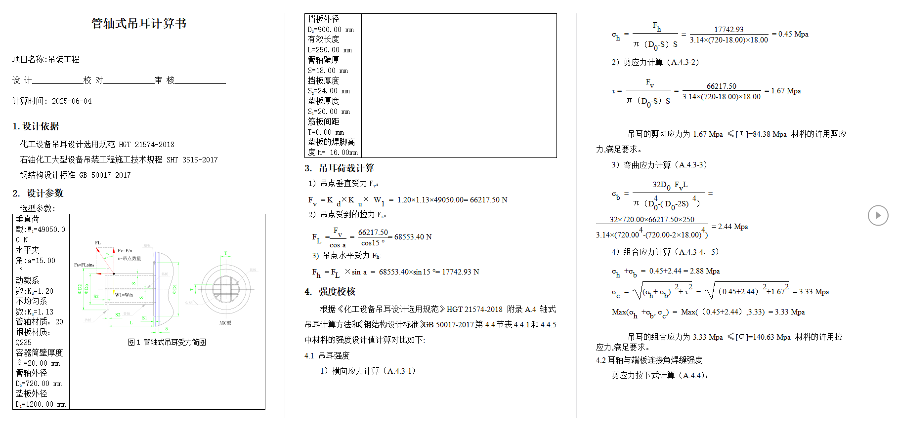 - 根据输入的荷载信息,自动进行规范轴式吊耳选型,可自由调整参数后验算。极大降低吊耳设计门槛,满足绝大多数工程技术人员的需求。