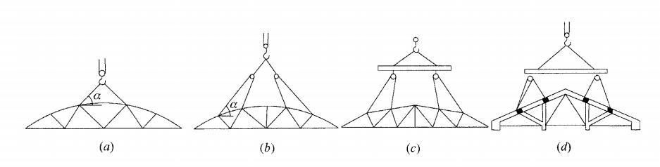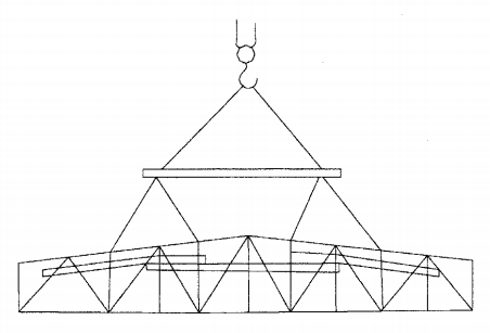 不能直接绑桁架,要先挂一个铁扁担(类似 “横梁”),再从扁担上绑吊索吊桁架,分散压力 |