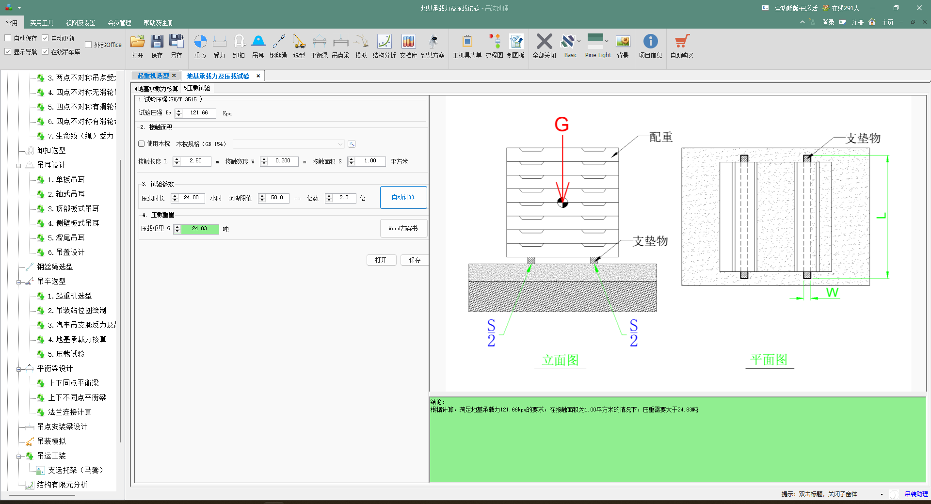 输入吊车支腿压力 121.66 kPa 及安全系数 2.0,模块自动计算出所需试验压重为 24.83 吨。