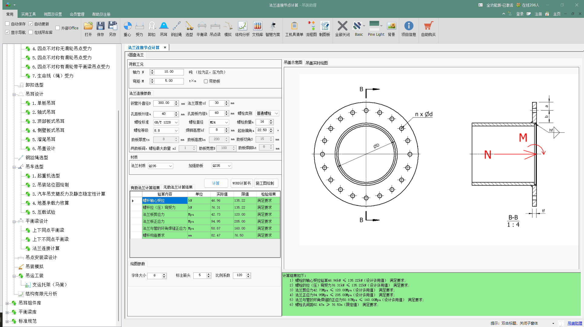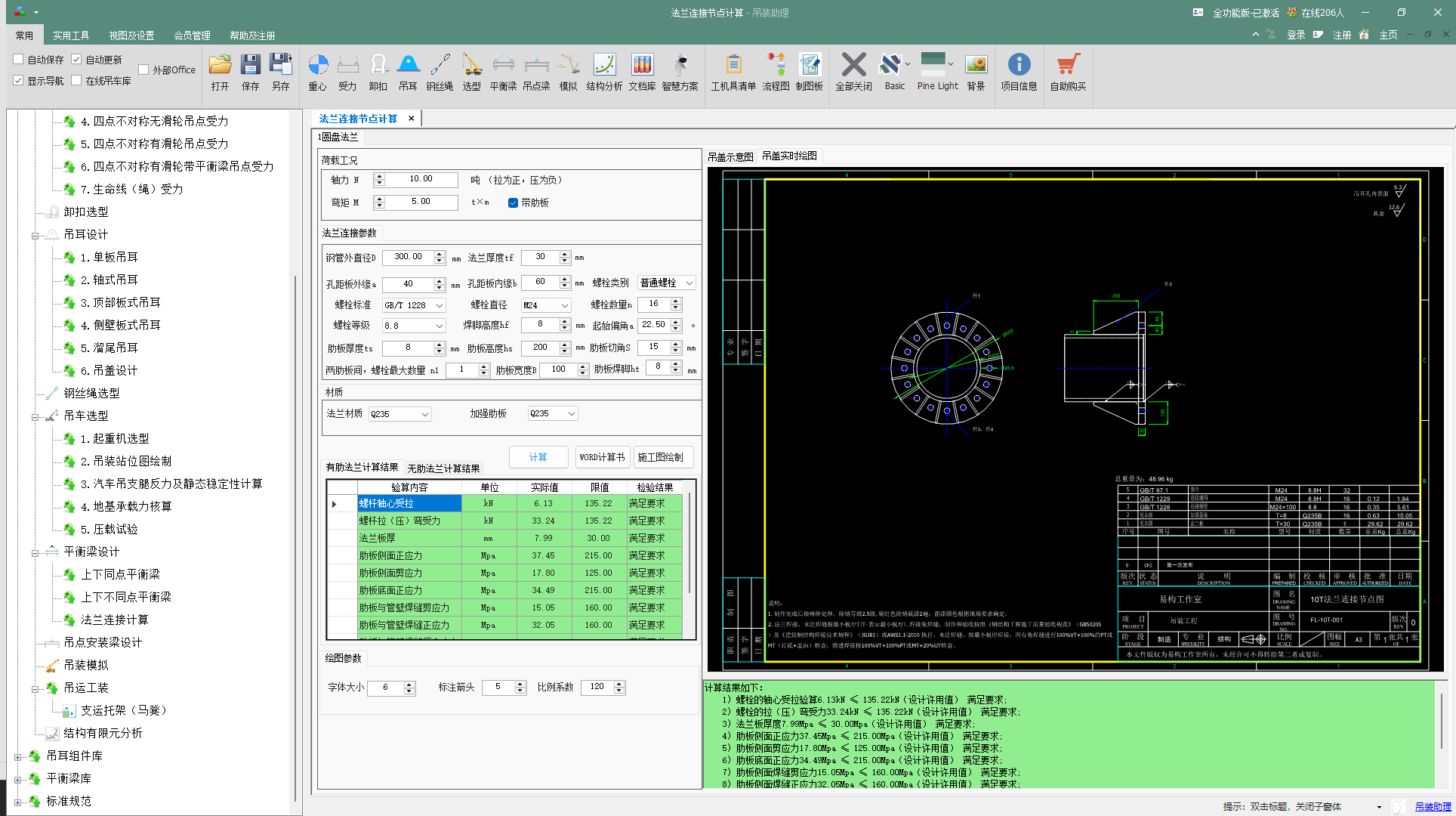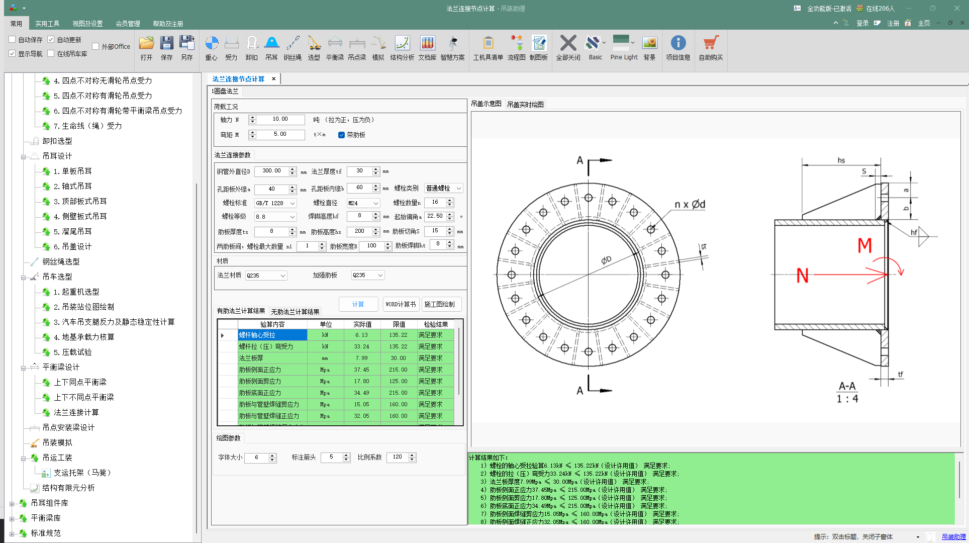核心机制:模块内置了针对吊装工况的力学模型。用户输入吊装载荷、钢丝绳角度、平衡梁尺寸等,程序自动计算并转化为作用在法兰连接面上的弯矩、轴力和剪力,并据此进行法兰板厚度、焊缝及整体刚度校核。