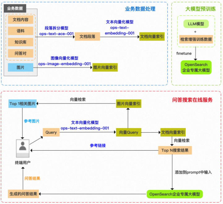 OpenSearch智能问答版系统架构主要包含业务数据处理、大模型预训练、问答搜索在线服务三个部分。