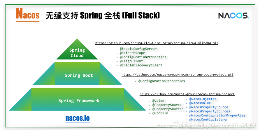 相比Consul、Eureka和Spring CloudConfig的原生解决方案,Nacos 计划在更适应云环境、多配置管理、容灾、管控、容量支撑和易运维等方面做更多的能力扩展,而在这次与Spring生态融合的设计上,则更多考虑了对于Spring Framework的直接支持,这将有助于用户将现有系统从Spring Framework平滑迁移到Spring Cloud微服务架构上。基于Nacos, 即便是Spring Framework开发的应用也可以通过使用简单注解来获取动态配置,进而实现微服务的能力。