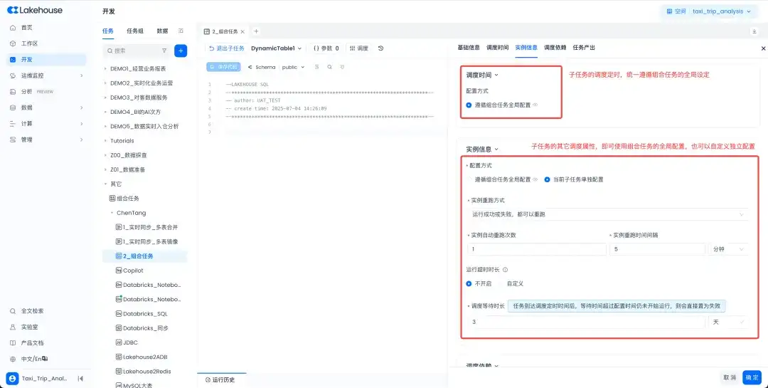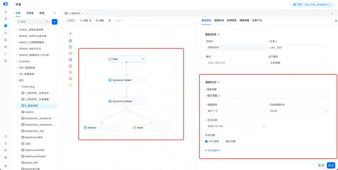 - 组合任务,复杂数据链路的“智能调度中枢”:全新推出组合任务类型,支持基于多种任务类型构建复杂工作流,可统一配置调度时间、参数,实现数据处理链路的“无级调速”(灵活控制更新频率),平衡数据新鲜度与加工成本,大幅提升复杂链路的编排、调度及运维能力。