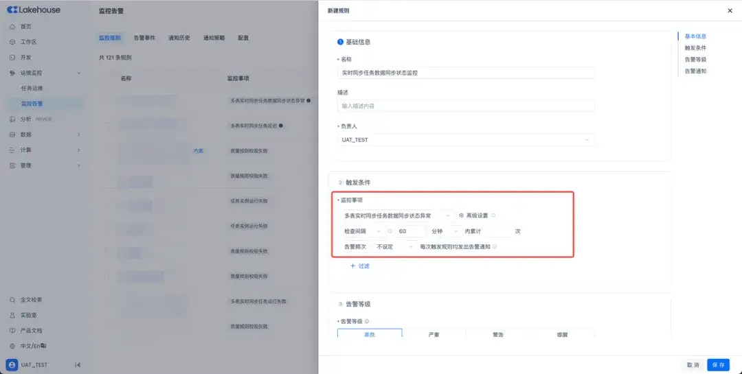 监控规则的监控事项中,新增了基于CheckPoint的实时同步任务健康度状态监控,用于监控实时同步任务是否在正常消费处理源端的变更数据。在设定的时间阈值窗口内异常次数(CheckPoint不更新)达到给定阈值后触发告警。