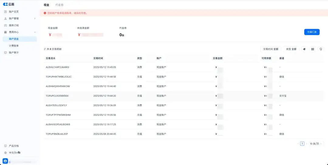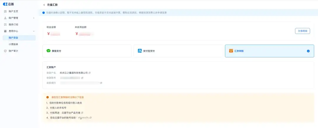 新增现金账户功能,用于账号下账单费用的统一支付管理。账户余额根据充值、账单出账情况实时变化,提供完整的余额交易明细查询功能。支付方式目前已经支持线上充值(微信支付、支付宝支付)和线下充值(对公转账,支持银行转账凭证上传)多种方式。