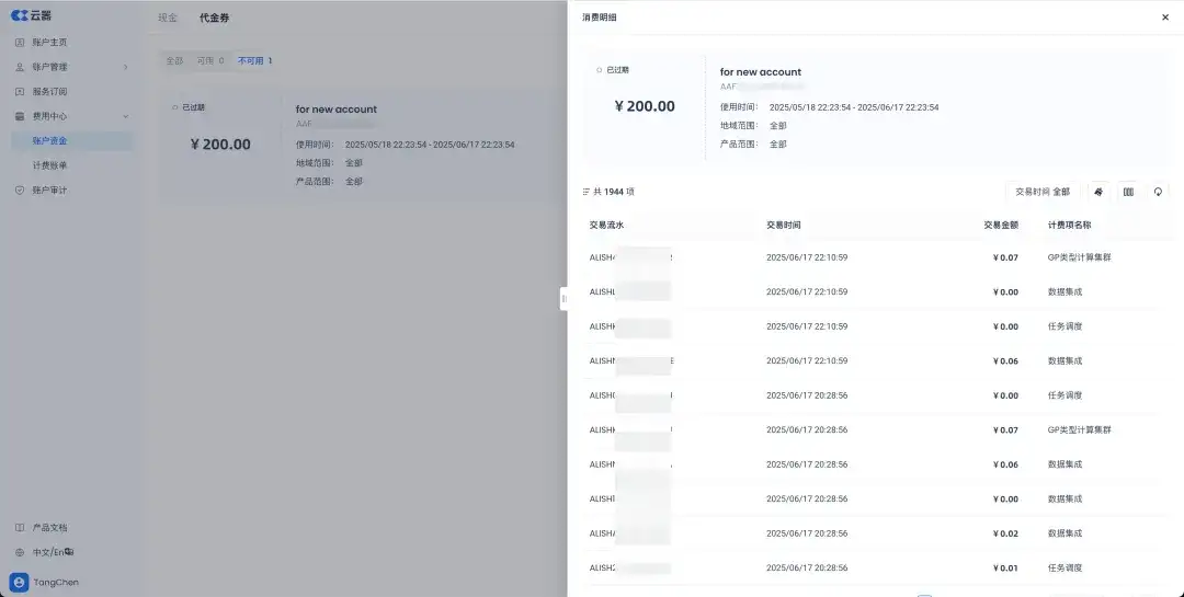 在现金账户之外,产品也提供了代金券功能。面向GA体验用户,默认会提供200元人民币额度的代金券,来满足对产品功能体验使用所需。代金券对于正式用户也同样有效。在最近的版本更新中,新增了代金券抵扣明细查询、可显示每笔订单的代金券使用情况,余额管理,有效期提醒等实用功能。