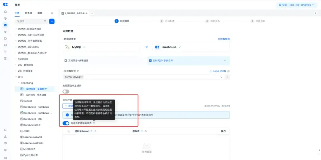 多表实时同步功能,先前已经支持了强大的Schema Evolution功能,即能自动感知源端的表的字段新增、修改等变化,在同步任务中自动适配,更新到目标表中。在近期的版本演进,额外扩展支持了自动适配源端动态加表的功能,系统可智能检测并自动同步源端新增的表,完全无需手动配置、重启任务。这个功能对于源端分库分表、自动增加新表的场景会非常有用,可大幅降低人为处置的复杂度、保障数据同步的连续性和完整性。