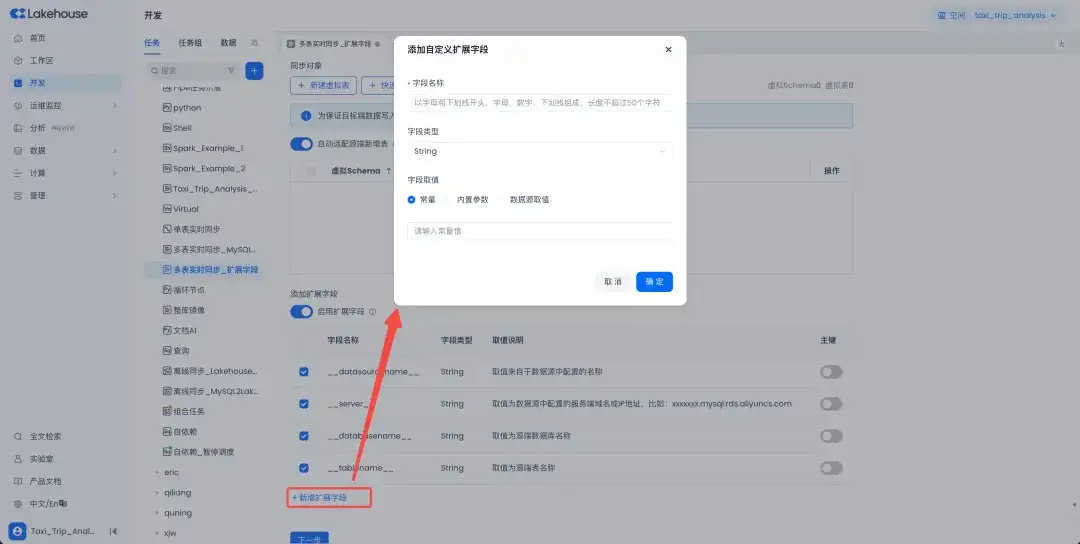 多表实时同步功能,先前支持了将数据源中的一些固定的字段,比如数据源名称、服务器地址、数据库名称、数据表名称等,设定为目标端表里的扩展字段,可用于对源端数据进行额外标识等使用场景。在实际使用中,我们发现还需要有自定义扩展字段的能力,在最新的发布版本中这个功能得到了支持。可以自定义扩展字段的名称、类型和取值,并按需设定是否作为联合主键,然后在目标端中得到体现。自定义扩展字段可极大地增加扩展字段的灵活性。