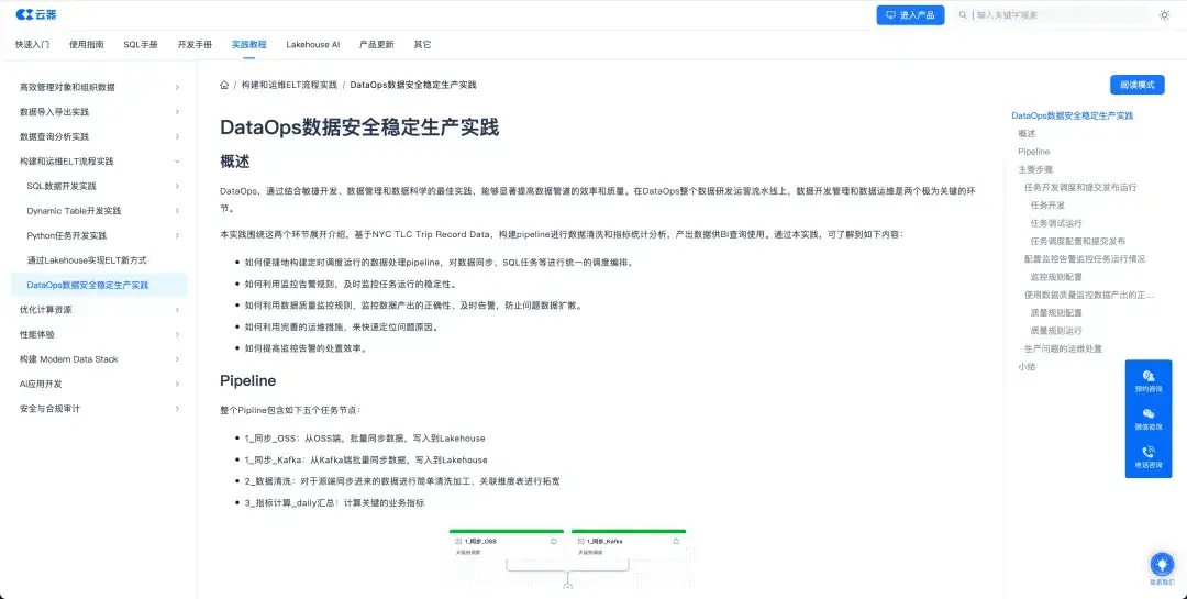 实践教程章节对高效管理对象和组织数据、数据导入导出、数据查询分析、构建和运维ELT流程、优化计算资源等多个方面有着全方位覆盖。在这里可以查阅到对于产品功能的高阶使用方式,来达成最佳使用实践。比如: