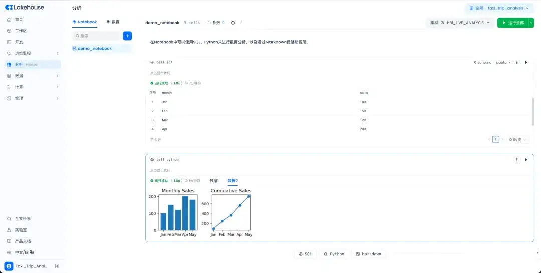 - Notebook模块,交互式分析的“全能工作台”:重磅发布数据分析Notebook功能,为数据科学家和分析师提供Python、SQL等多语言交互式分析环境,支持灵活的数据探索与高效洞察,重塑数据分析工作流。