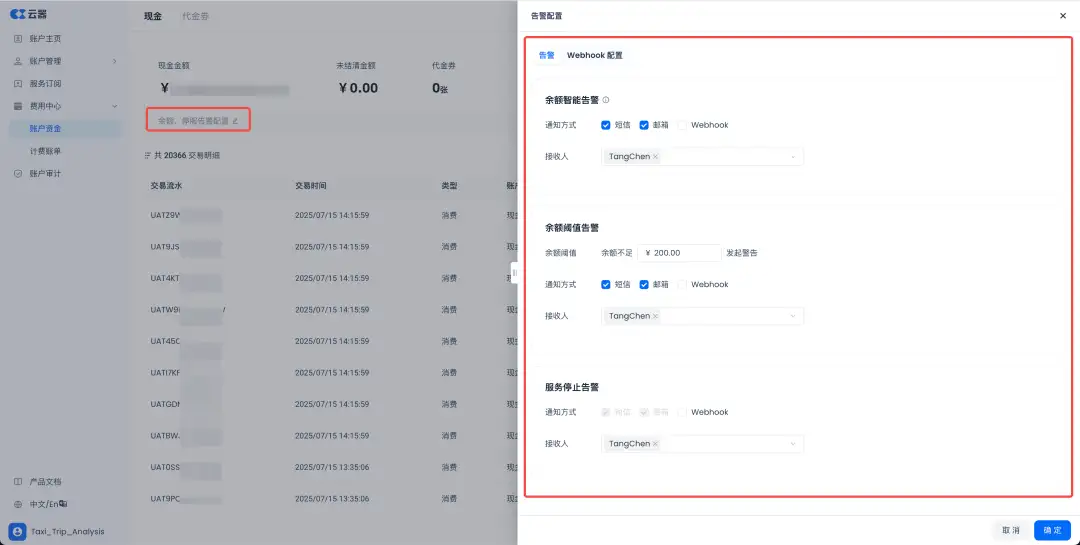 针对余额不足、资源停服场景提供智能提醒,支持短信、邮箱、自定义IM(基于Webhook)等多种消息接收方式,确保业务连续性。