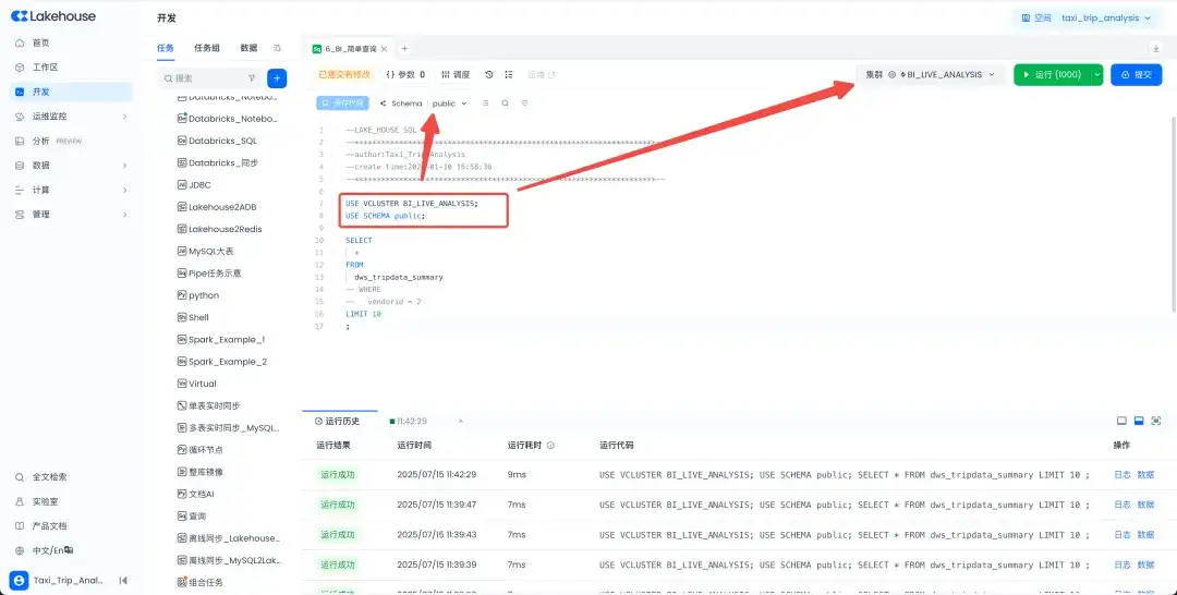 代码智能感知:产品中的较多功能,比如代码参数的智能识别、数据血缘解析等,都是基于对代码的智能感知分析。基于此,近期也进行了一个体验优化的改造:在代码中USE SCHEMA/USE VCLUSTER语句执行后,自动回显,与页面上的配置联动。这个优化可以有效避免在页面选择的SCHEMA/VCLUSTER和代码中给定的不一致的情况下,带来的理解困扰,便于快速感知SQL运行使用的数据和集群环境。我们会坚持不断落地这些细微的优化改进,来持续提升任务开发等功能使用体验和效率。