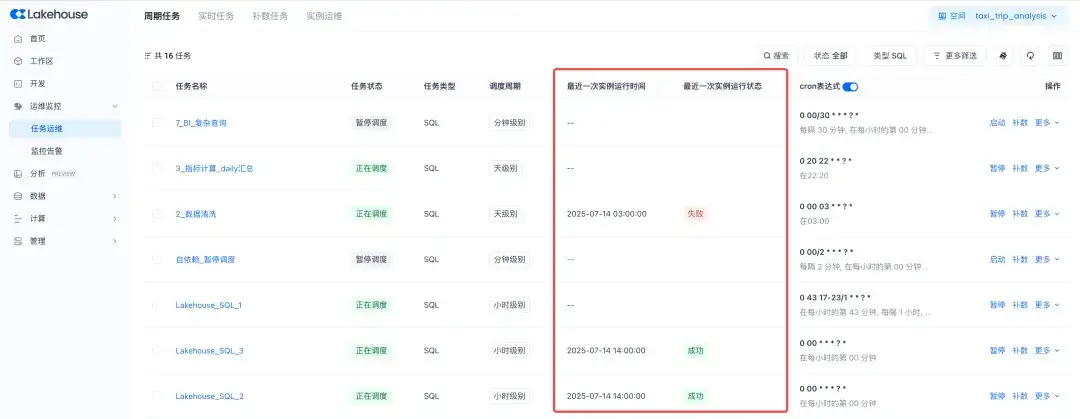周期任务列表中,新增展示了当前周期任务最近一次实例的运行时间和状态信息,提升运维可观测性。便于进行任务管理时,对任务的运行状态能够一目了然,特别适用于分钟级的高频调度和自依赖调度的任务运行情况查看和辅助问题定位。