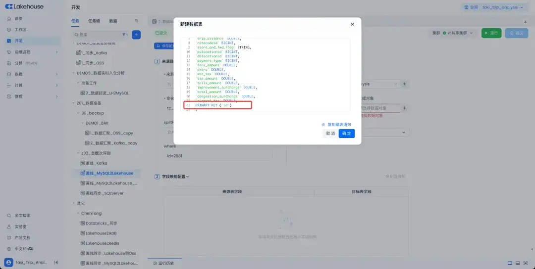 离线同步中的一键建表功能迎来重要升级,新增自动感知源端表结构的智能识别能力。系统现可自动扫描源端表的主键约束,在目标端Lakehouse生成建表语句时自动保持PRIMARY KEY、NOT NULL、UNIQUE等关键约束。