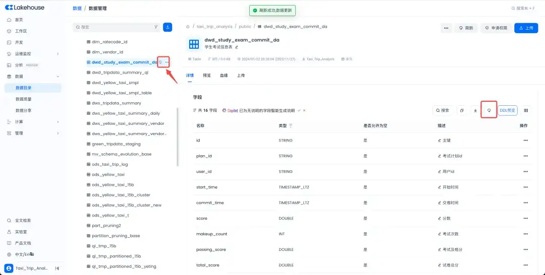 元数据信息强制更新功能:数据管理表详情页的信息,系统内置了自动刷新机制,在监测到表结构变更时会自动更新,但偶发会出现刷新延迟的情况,对于新增、改动后的表的信息,可能没有及时更新。新增强制刷新功能,支持用户主动触发手动刷新表详情页面获取元数据的最新信息。