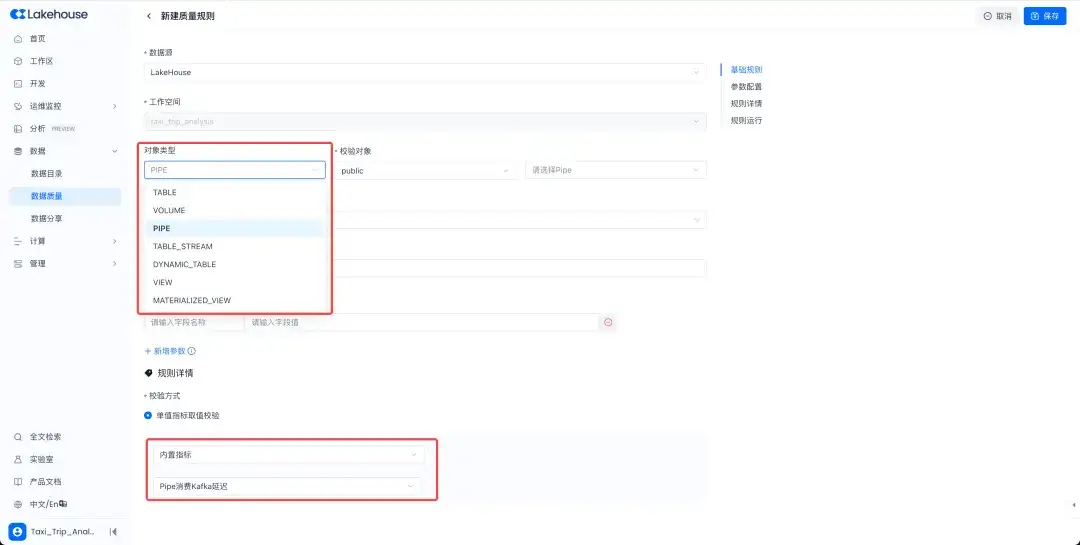 近期版本发布,在质量规则中新增拓展支持了对 Pipe、Volume、Table Stream 三种类型对象的监控,比如对于Pipe而言,可以监控消费源端Kafka的堆积、及时发现数据链路的处理延迟问题。至此,质量规则对Lakehouse中主要对象,都提供了数据质量校验的完整覆盖,可按需配置使用。