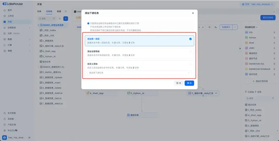 新增下游节点批量添加功能:任务组新增基于任务血缘链路批量添加下游子节点功能。支持添加一层、全部层级、及自定义层级多种添加方式。