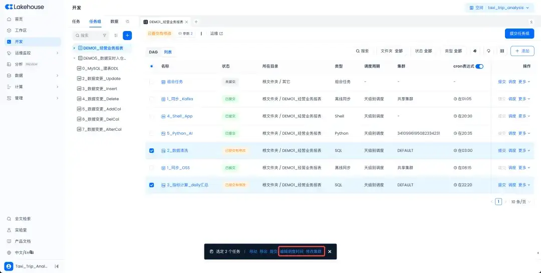 任务组内任务节点批量操作能力:任务组切换到列表模式下,新增支持批量修改集群、批量修改调度定时等批量操作,便于对一批节点统一快速处置。
