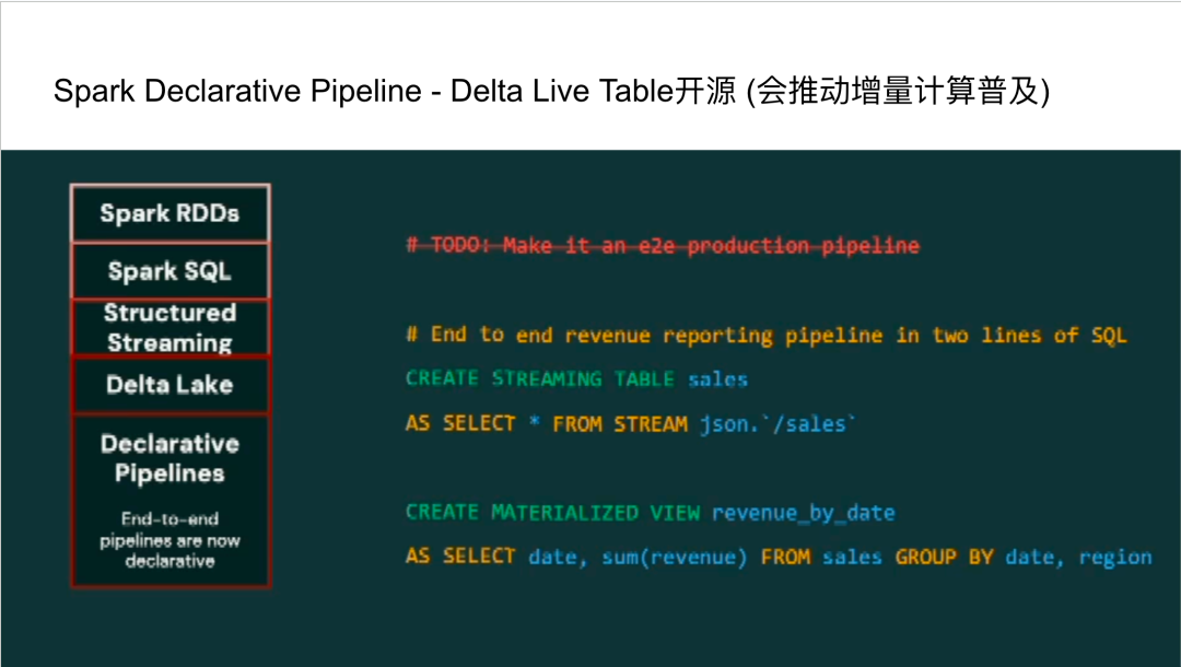 - 声明式管道( Declarative Pipeline):回顾Spark的发展历史,从繁琐的RDD编程到Spark SQL,再到Structured Streaming和Delta Lake,每⼀次迭代都旨在提升易⽤性和功能。声明式管道(Declarative Pipeline)的引⼊,旨在简化复杂数据⼯作流的构建。尽管Databricks的闭源产品Delta Live Tables早已具备类似功能,但将其开源将极⼤地普及增量计算模式,使更多⽤户受益。