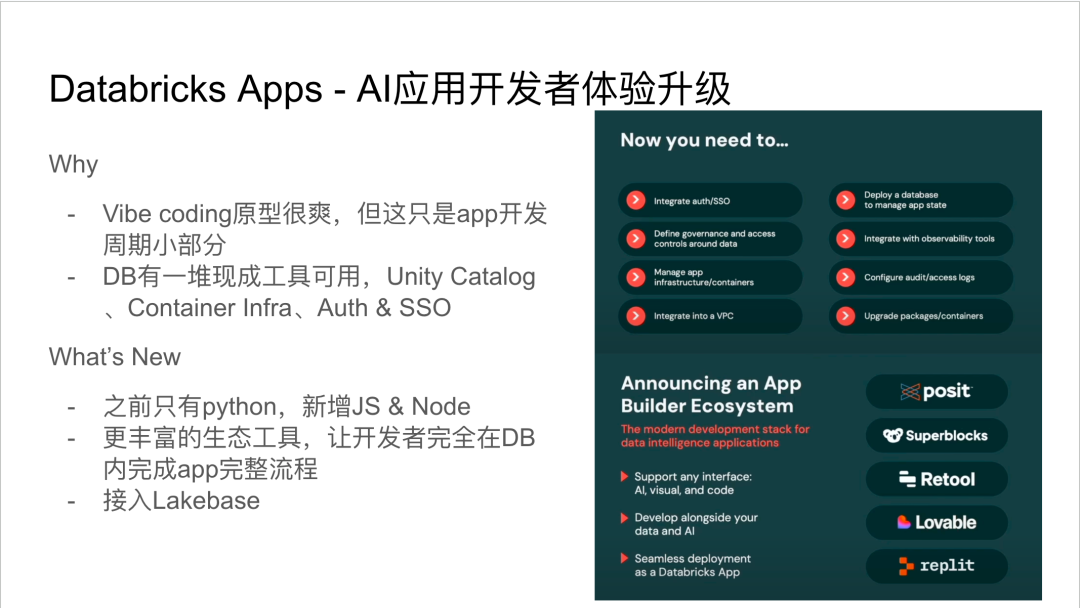 Databricks的成功正是这种趋势的体现:通过平台化整合数据处理、AI开发、应用构建的各个环节,让用户在一个统一的环境中完成从数据到应用的全流程。