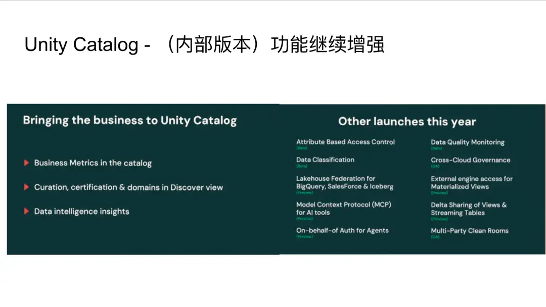 Unity Catalog作为Databricks Lakehouse平台的核⼼组件,持续进⾏功能增强。本次⼤会强调了其在连接企业数据与业务部⻔、提供数据发现功能以及通过数据注⼊(Data Ingestion)提供洞察⽅⾯的改进。Unity Catalog旨在通过⾃动化⽅式连接数据分析部⻔和业务部⻔,实现业务指标的统⼀管理,并帮助⽤户发现不同部⻔间的数据,提升数据易⽤性。此外,它还通过⼤型语⾔模型(LLM)或⼩型AI组件辅助理解数据,并增强了对多数据源、监控和多云监管的⽀持。