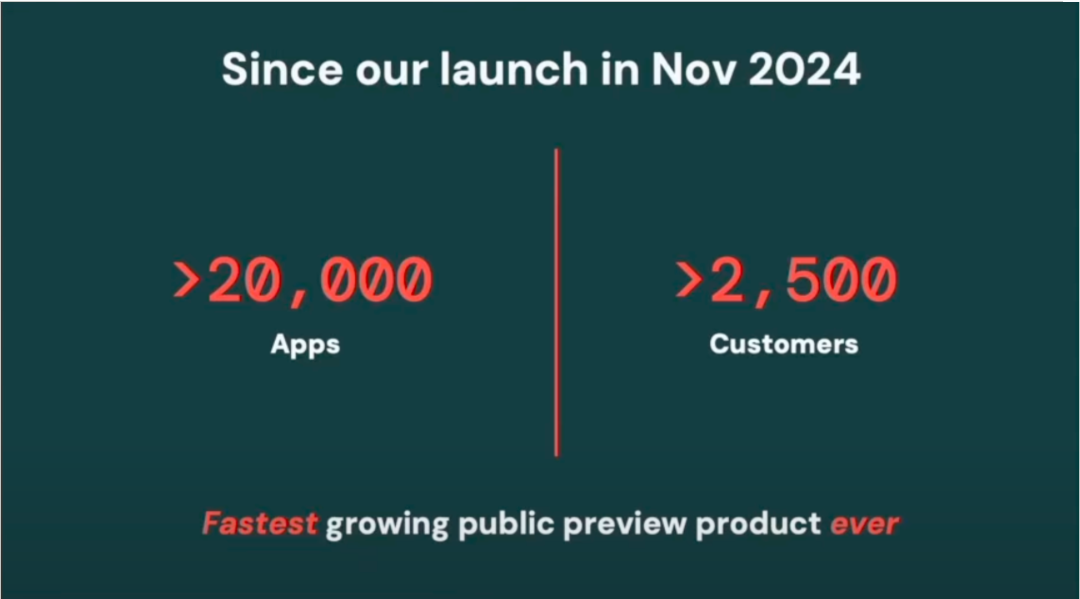 Databricks宣称,⾃发布以来,Databricks Apps是其历史上增⻓最快的产品,⽬前已有超过2万个应⽤。