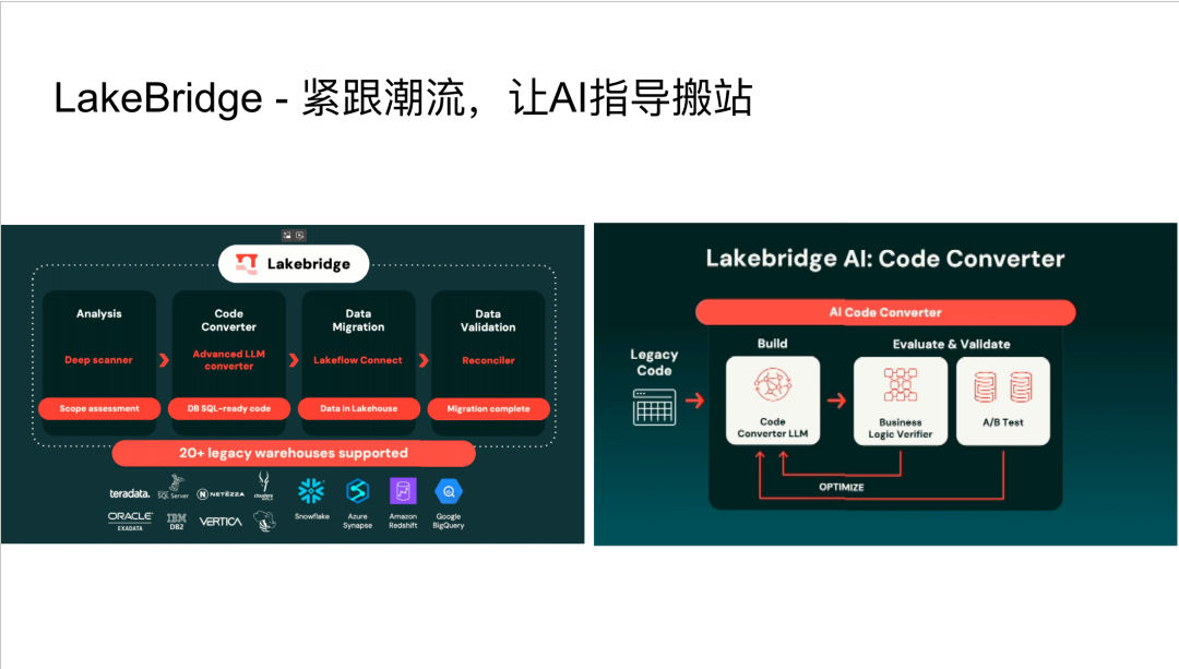 LakeBridge是 Databricks 与合作伙伴共同开发的搬站⼯具,旨在简化从传统数仓到Databricks平台的迁移过程。其独特之处在于集成了AI能⼒,能够分析现有数仓(如Snowflake)的SQL脚本,并将其翻译成Databricks SQL。Lake bridge不仅执⾏翻译,还会进⾏评估和校准,尝试优化SQL写法,以确保迁移后的性能和效率。这为企业提供了更智能、更⾼效的数据迁移解决⽅案。