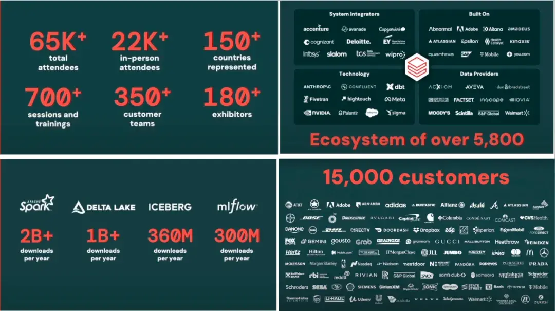规模与影响力:超过20,000名现场参与者,和700+技术分享,体现了数据AI技术在企业中的重要地位。Databricks生态系统日益壮大,其开源产品Spark和Delta Lake的持续增长显示了强大的社区影响力。