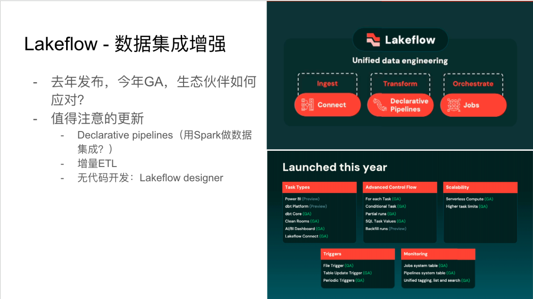 Lakeflow是Databricks在数据集成领域的重要产品,于去年发布并于今年正式GA(General Availability)。过去,数据集成通常由第三⽅⽣态⼚商完成,但现在Databricks和Snowflake等平台都开始涉⾜这⼀领域,预⽰着数据集成市场竞争的加剧。Lakeflow利⽤Spark的声明式管道来处理复杂的⼯作流,并⽀持⾃动增量ETL,智能识别已计算数据,避免重复计算。其⽆代码开发功能Lakeflow Designer,通过⾃然语⾔描述即可实现数据集成,并通过⼤语⾔模型提供反馈和微调能⼒,极⼤地降低了数据集成的⻔槛。