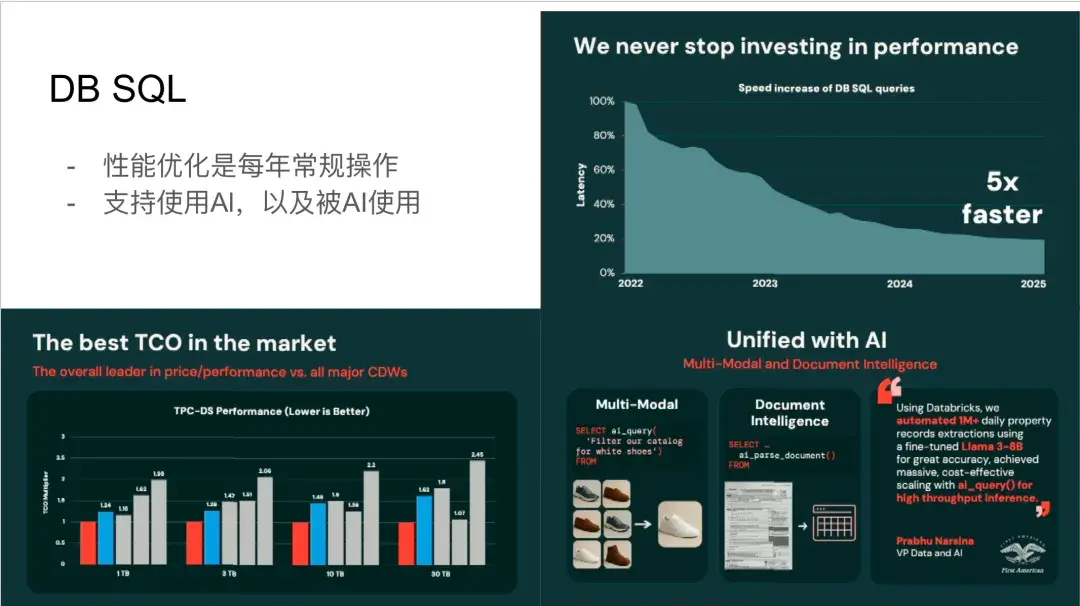 DBSQL作为Databricks内部优化的Spark版本,持续在性能上取得突破。 Databricks宣称DBSQL⾃2022年以来性能提升了五倍。 尽管每年都会有与Snowflake等竞争对⼿的性能对⽐, 但Databricks强调其在总拥有成本(TCO)⽅⾯的优势, 即通过更低的定价和更灵活的资源配置来提供⾼性能。此外,DBSQL还集成了AI功能,⽀持多模态查询,并提供了AI函数 来调⽤不同的模型,实现图像处理、⽂本提取、分类和⽂档解析等操作。⽬前这些AI功能主要体现在SQL函数层⾯,未来有望进⼀步扩展。