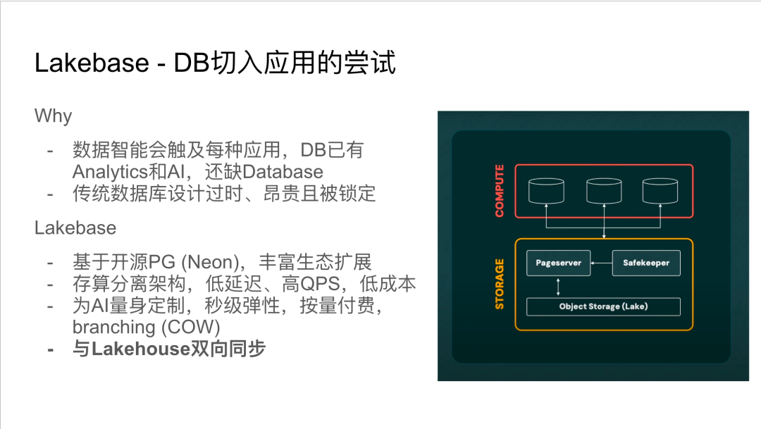 Databricks收购Neon是本次⼤会的⼀个重⼤事件。Neon是⼀家专注于Serverless PostgreSQL的初创企业。Databricks收购Neon的⽬的是为了补⻬其在传统数据库场景的短板,支持Databricks App,同时构建更完整的数据智能拼图。 Databricks旨在提供⼀个具备低延迟、高QPS和低成本的存算分离TP架构。这种架构能够实现秒级弹性伸缩和数据分⽀(Branching)功能,特别适⽤于AI场景中频繁尝试新特性的需求。尽管Databricks强调Lakebase与 Lakehouse之间的 “ ⽆ETL” 双向同步,但实际上仍涉及数据同步过程。
