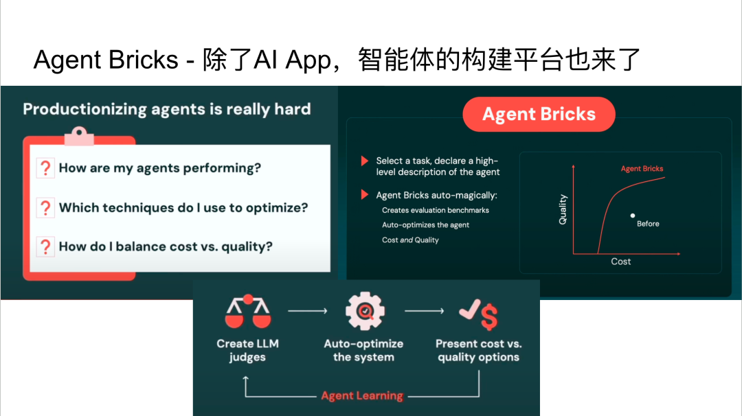 Agent Bricks等工具的推出,本质上是在解决AI开发的"工程化"问题。它们提供了从开发到部署到优化的完整工具链,让AI应用开发更像传统软件开发——有明确的流程、工具和最佳实践。