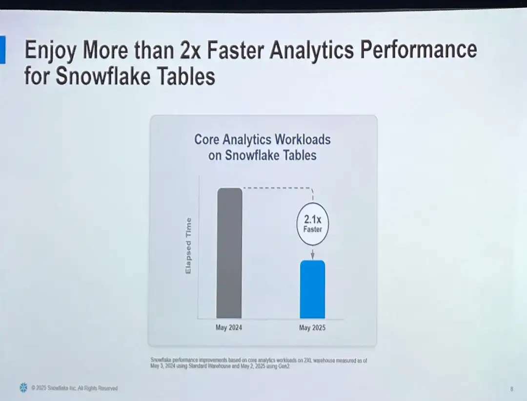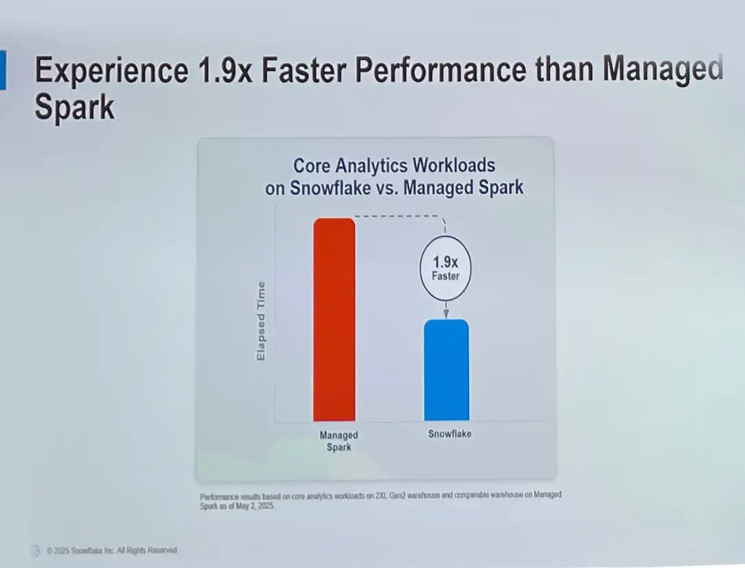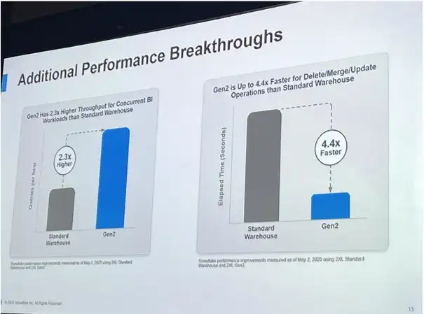 Snowflake 推出了新一代数据仓库技术 DW Gen2(Data Warehouse Generation 2)。此次升级在性能层面进行了全面优化,尤其在数据更新(Update)和合并(Merge)方面实现了更高效率。据官方展示,相较前代产品,新版本在分析性能上提升达两倍。同时,该技术还声称在与 Spark 等主流数据仓库的对比中,具备更强的性能优势。DW Gen2 的推出,不仅意味着 Snowflake 对传统数据仓库核心架构的重大迭代,也为企业用户带来了更快、更稳定的数据处理体验。