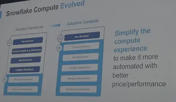 Snowflake 推出了一项重要的新能力:自适应计算(Adaptive Computing)。这项功能的核心在于让用户无需再手动配置计算资源(如虚拟仓库的数量、规格、CPU/内存配比等),而是通过智能系统根据实际工作负载自动进行资源匹配。