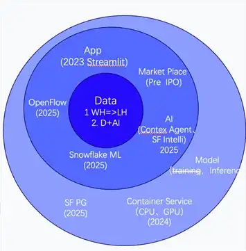二圈:Market Place、App、ML、OpenFlow、AI(Contex Agent、Snowflake Intelligence)